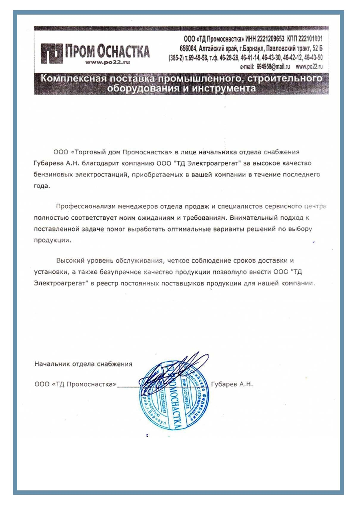 [ALT] => Отзыв контрагентов о компании ООО «ТД Электроагрегат» и исполненном проекте для ООО "Торговый дом Промоснастка", г. Барнаул
