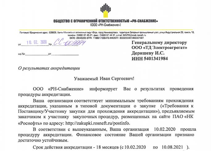 • Аккредитация ООО "ТД Электроагрегат" в ООО "РН-Снабжение" от 10.02.2020 г.